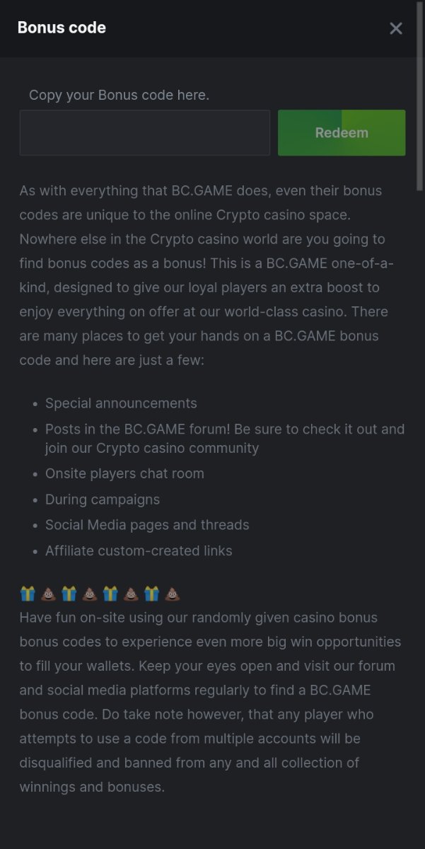 If you're referring to the prize in the forum challenge then head to your inbox it's right there if your entry is eligible. Next, Copy and paste your code and tap menu on bc.game then tap bonus code icon and fill in your code and redeem! If you can't find your inbox on forum just visit http://forum.bc.game/messenger